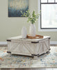 Unlock a quaint touch of farmhouse style and convenience in your living area with this occasional table set. Inspired by the rugged looks of antique furniture, this set charms with a distressed light gray finish that enhances the wood's natural grain. Lift top table makes for an easy work or dining surface. End tables each include a power strip with dual USB port ts.