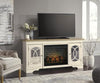 Elevating the art of traditional cottage styling, this TV stand with fireplace insert is beautifully in tune with your taste. Its antiqued two-tone aesthetic blends a chipped white with a distressed wood-tone top for added charm. The cabinet doors, with decorative fretwork over mirrored glass, add a lovely twist. And what really turns up the heat: an electric infrared fireplace insert with faux firebrick surround that operates with or without infrared heat. With the touch of a button, adjust the temperature and the flame brightness, and set the timer for long-lasting enjoyment.